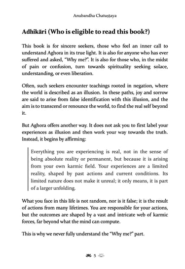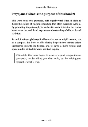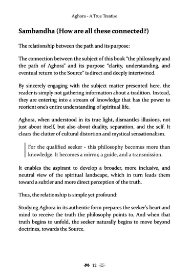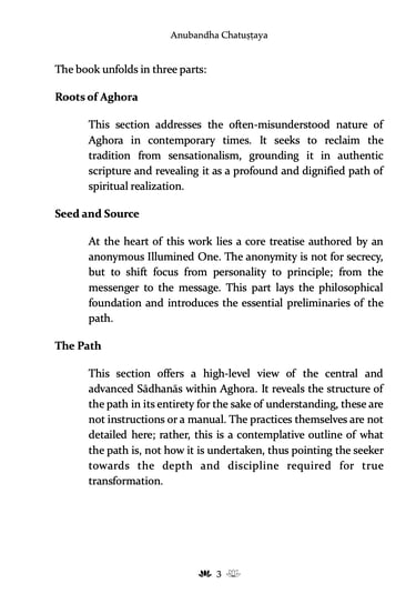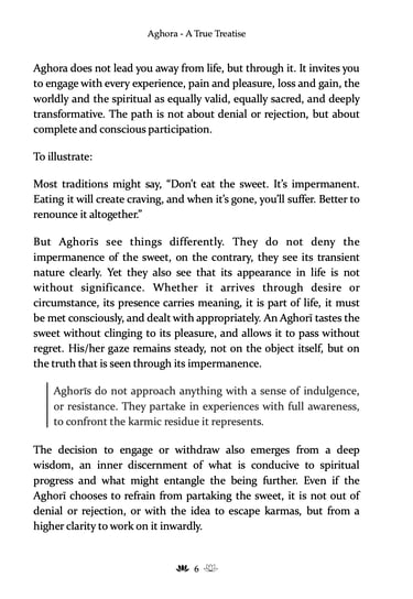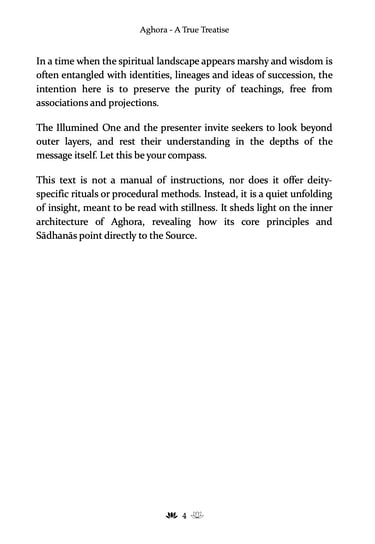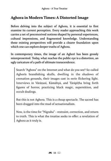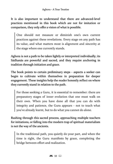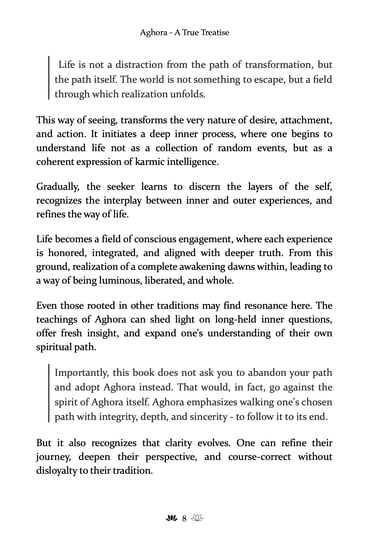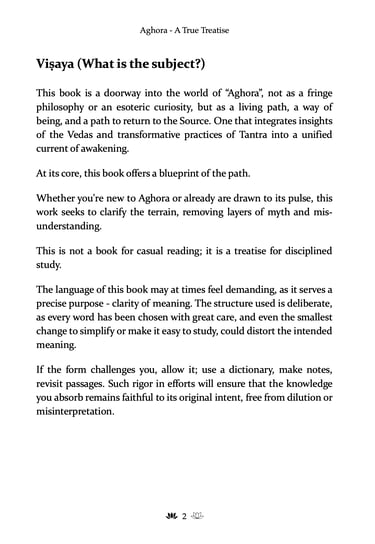 This book does not ask you to abandon your path and adopt Aghora instead. That would, in fact, go against the spirit of Aghora itself. Aghora emphasizes walking one's chosen path with integrity, depth, and sincerity - to follow it to its end. Aghora does not compete with other approaches, it complements them. It invites the seeker to stand fully in life, in whatever form their path takes, and walk it with uncompromising truth.
