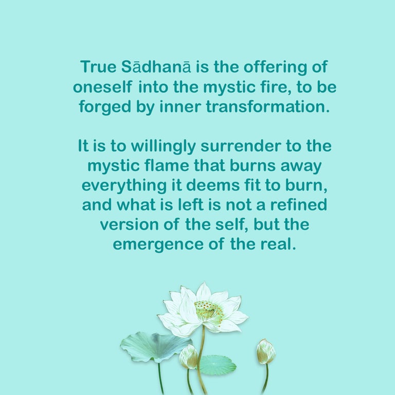 True Sādhanā is the offering of oneself into the mystic fire, to be forged by inner transformation. The greatest tragedy is the decline of true Sādhanā. Aghora is perceived as some shortcut to power through lawlessness and indulgence. One does not walk the path of Sādhanā for experiences, visions, or gains, or to become something. It is a return journey back to the source.